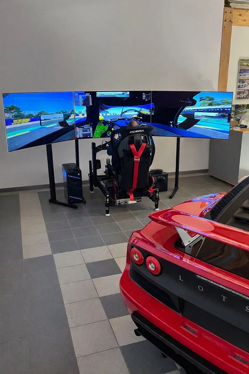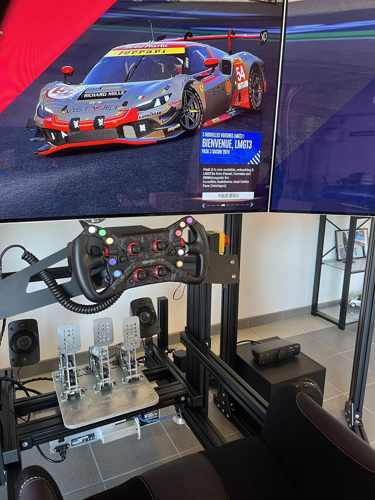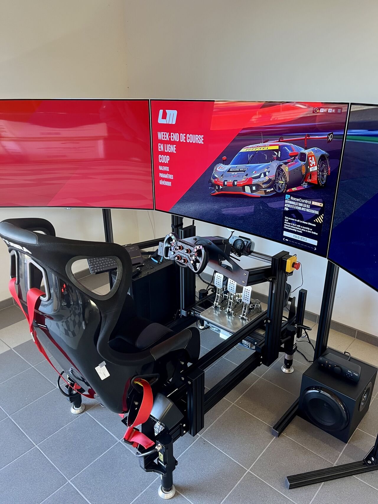 Nous concevons des installations capables d'accueillir des configurations exigeantes, comme les setups multi-écrans grand format, tout en garantissant une intégration soignée et une expérience de simulation sans compromis.