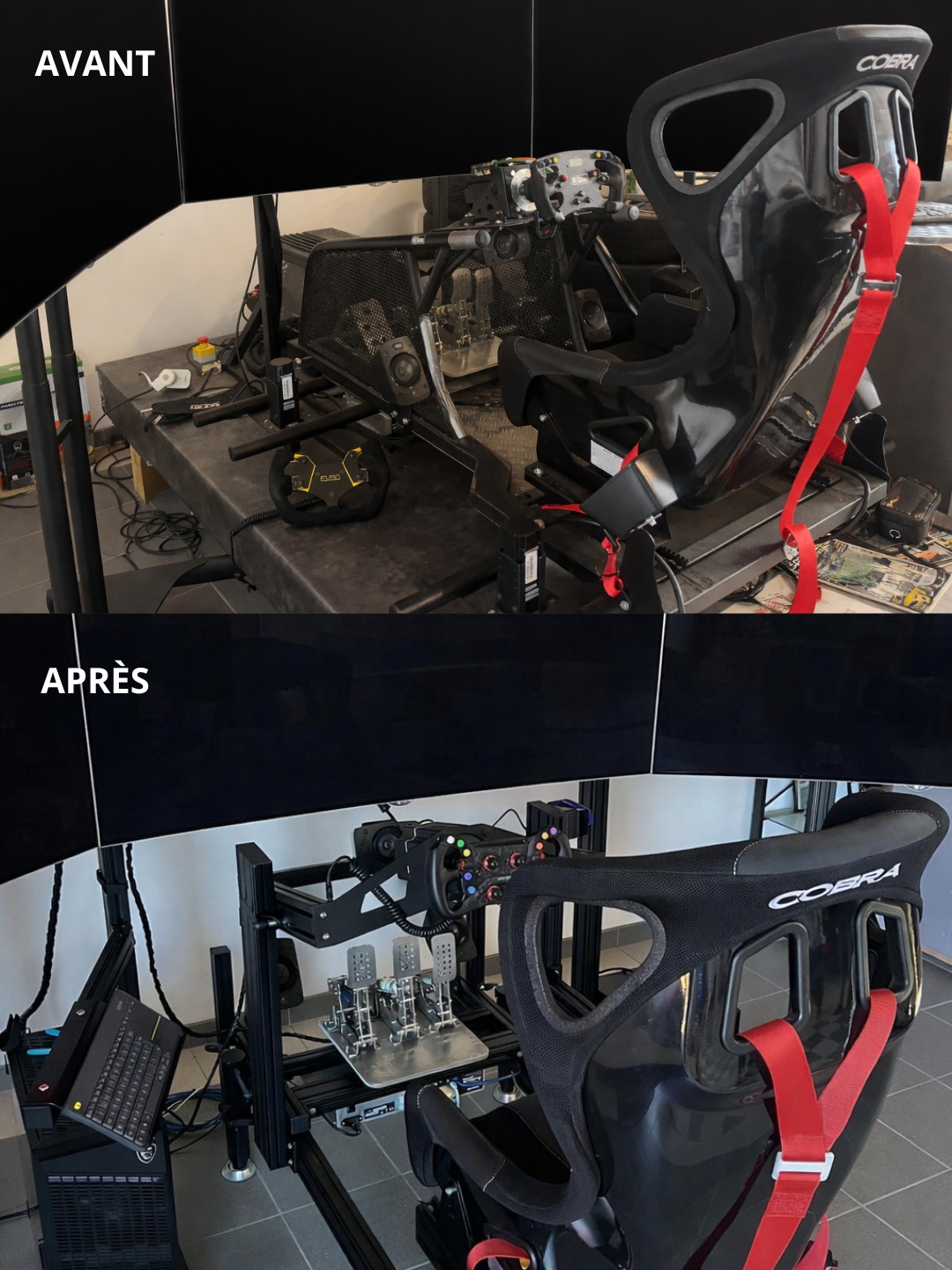 Chaque simulateur est assemblé dans nos ateliers en France avec une attention particulière portée à la qualité et à la durabilité. Nous garantissons la fiabilité des composants pour un usage intensif, veillons à une ergonomie adaptée à des utilisateurs multiples et assurons une compatibilité parfaite avec vos logiciels et plateformes de simulation, tels qu’iRacing, Assetto Corsa ou rFactor.